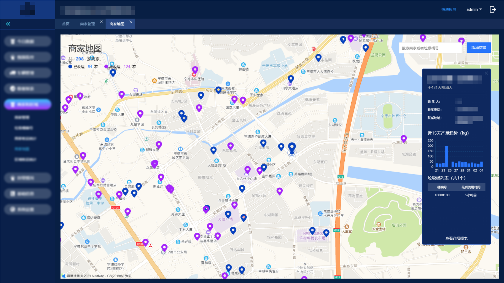 2、商家分布管理、路线智能规划,省人省车省油,高效收运;