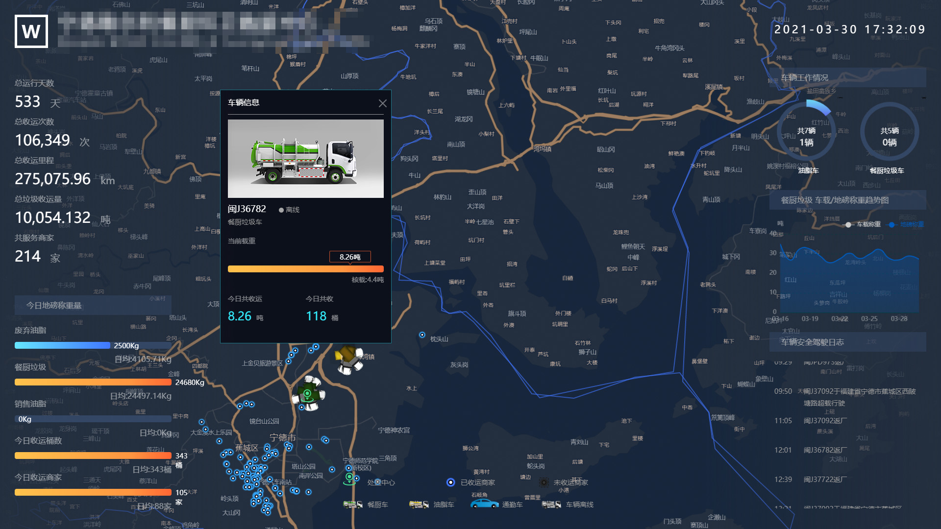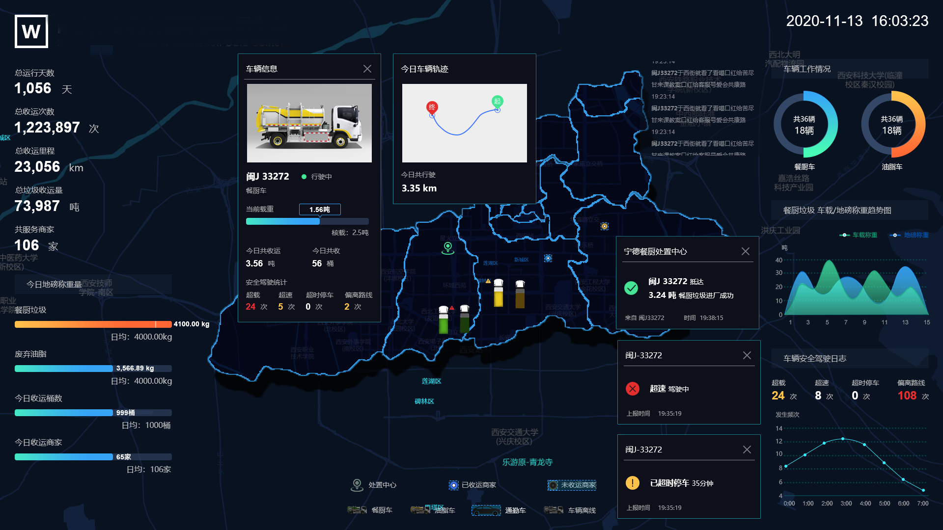 牧云数据承建的福建省某智慧餐厨垃圾收运项目,通过智慧环卫一体化运营管理平台,对餐厨、油脂收运全过程进行实时在线监控,实现人员、车辆、商家、设备和事件处置的统一汇集与管理。