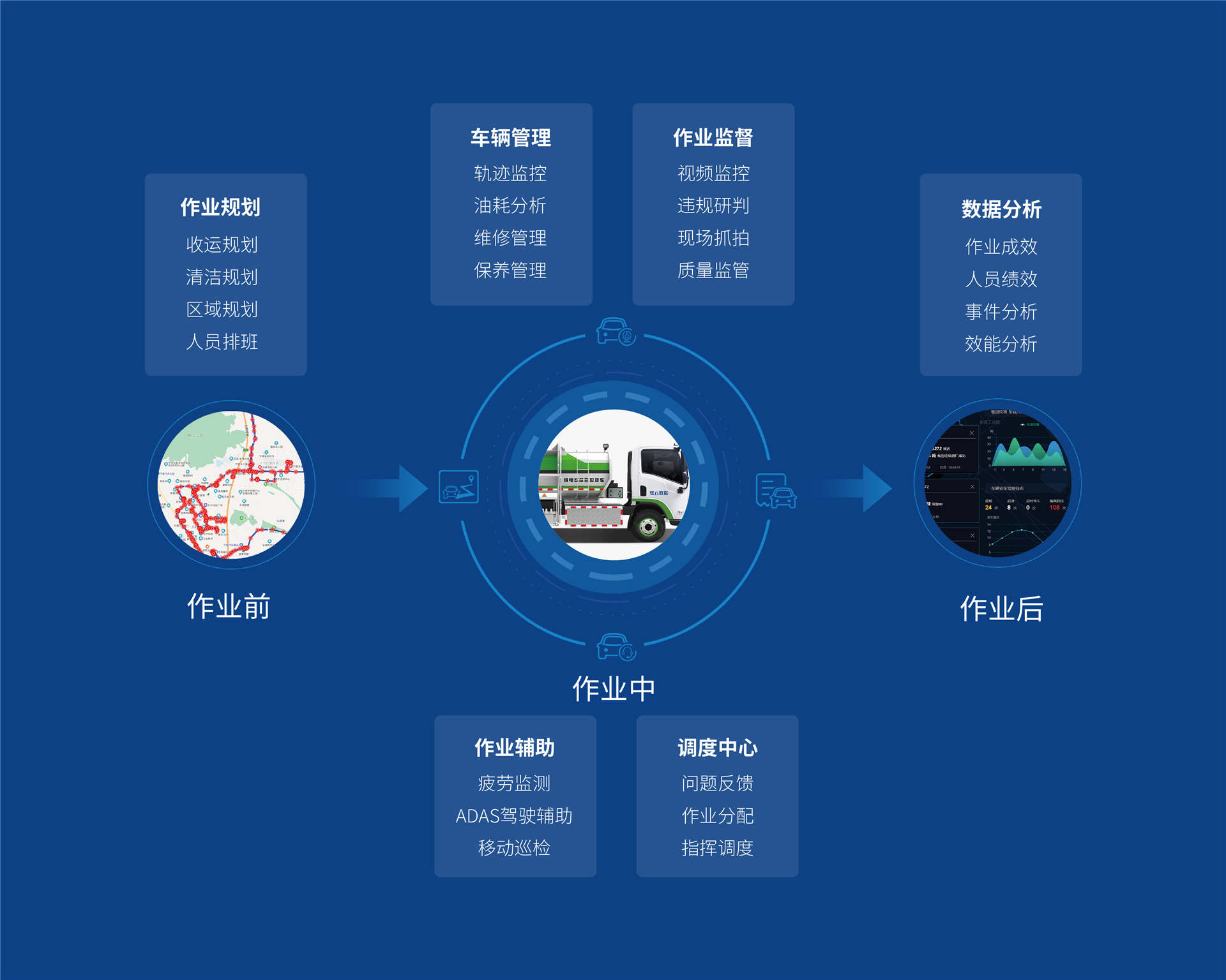 智慧环卫一体化运营管理平台依托边缘计算、IOT-ABC等先进技术手段,形成以车辆、人员、事件、数据为核心的集中运营管理体系,实现作业前调度规划、作业中统一监管、作业后监督分析的全流程管控,将传统人力监管改变为自动化、智能化、数据化、科学化的管理模式。