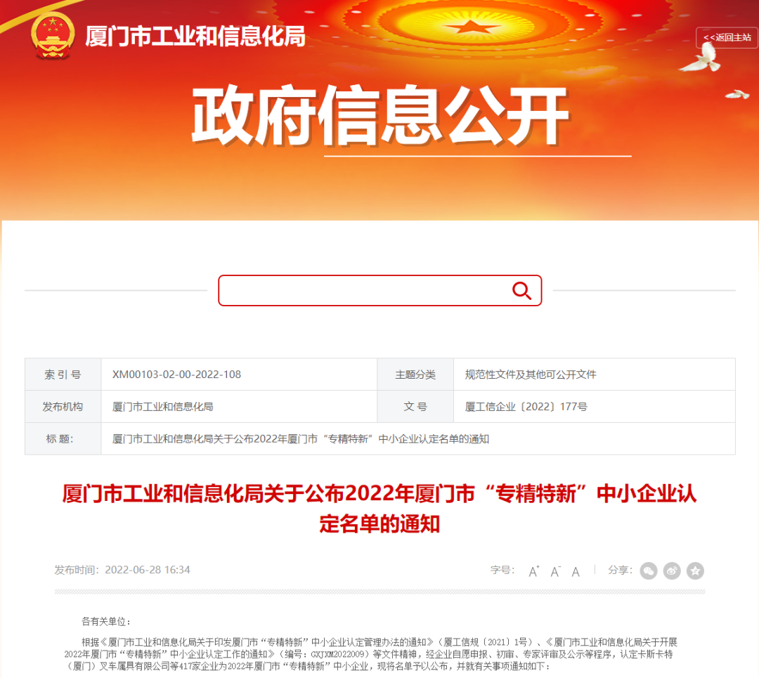 近日,厦门市工业和信息化局公示了2022年厦门市“专精特新“中小企业认定名单,厦门牧云数据技术有限公司作为环保行业数字化解决方案服务商,凭借专业的平台服务和技术创新能力成功入选。